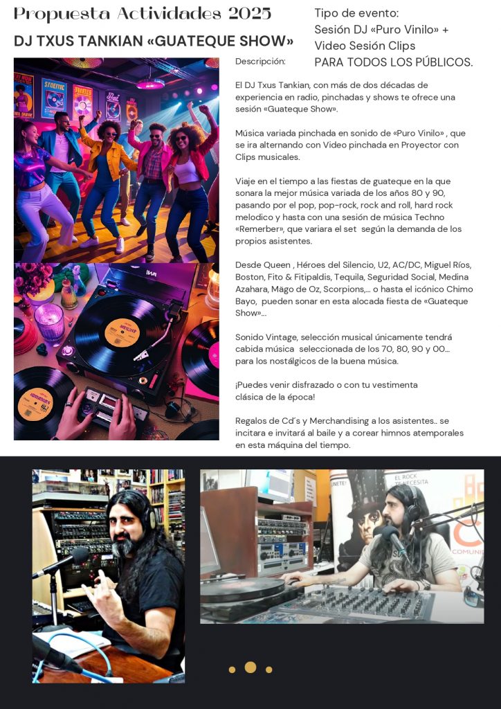 Sesión adaptada al evento en cuestión, también posibilidad de ofrecer lo que es el denominado «GUATEQUE SHOW»: El DJ Txus Tankian, con más de dos décadas de experiencia en radio, pinchadas y shows te ofrece una sesión «Guateque Show» que consiste en una sesión de música variada pinchada en sonido de «Puro Vinilo» , que se ira alternando con Video pinchada en Proyector con Clips musicales.Viaje en el tiempo a las fiestas de guateque en la que sonara la mejor música variada de los años 80 y 90, pasando por el pop, pop-rock, rock and roll, hard rock melodico y hasta con una sesión de música Techno «Remember», que variara el set según la demanda de los propios asistentes. Desde Queen , Héroes del Silencio, U2, AC/DC, Miguel Ríos, Boston, Fito & Fitipaldis, Tequila, Seguridad Social, Medina Azahara, Mägo de Oz, Scorpions,… o hasta el icónico Chimo Bayo, pueden sonar en esta alocada fiesta de «Guateque Show»… Sonido Vintage, selección musical únicamente tendrá cabida música seleccionada de los 70, 80, 90 y 00… Para los nostálgicos de la buena música. ¡Puedes venir disfrazado o con tu vestimenta clásica de la época! Con regalos de Cd´s y Merchandising a los asistentes.. se incitara e invitará al baile y a corear himnos atemporales en esta máquina del tiempo.