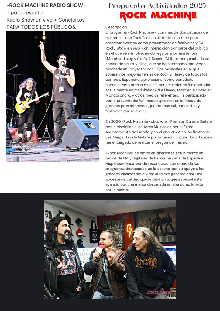 El programa «Rock Machine», con más de dos décadas de existencia, con Txus Tankian al frente se ofrece para amenizar eventos como presentador de festivales y DJ Rock, show en vivo, con interacción por parte del público en el que se irán ofreciendo regalos a los asistentes (Merchandising y Cds´s..), Sesión DJ Rock con pinchada en sonido de «Puro Vinilo» , que se ira alternando con posibilidad de Video pinchada en Proyector con Clips musicales en el que sonarán los mejores temas de Rock & Heavy de todos los tiempos. Experiencia profesional como periodista especializado prensa musical por ser redactor/colaborador actualmente en Mariskalrock /La Heavy, también su paso en Mondosonoro, y otros medios referentes. Ha participado como presentador/animador/spreaker en infinidad de grandes presentaciones, jurado musical, conciertos y festivales que lo avalan.